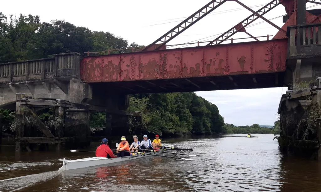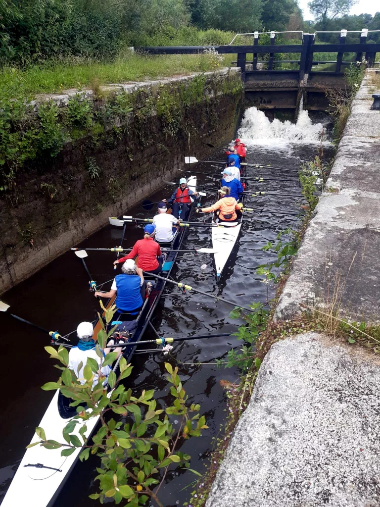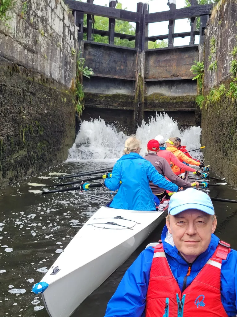 Was macht Rudern in Irland zum Abenteuer? Über 100 Jahre alte kleine Schleusen, die von Hand betrieben werden, und in die 2 gesteuerte Vierer gerade so reinpassen! Ein schmales Gewässer auf dem früher Lasten getreidelt wurden und das flussaufwärts linker Hand von einem Treidelpfad begrenzt, rechter Hand von großen Felsen unter Wasser und Abwärtsströmung gesäumt ist, immer wieder durchsetzt von Schilf oder auch mal umgestürzten Bäumen! Hier ist Rudern nicht „Strecke machen“, sondern Langsamkeit, Geschicklichkeit und Blick für das Detail. Auf den breiteren Flüssen erleben wir gezeiten-abhängigen Wasserstand, Strömung und Wind, der uns auch mal von der falschen Seite erwischt. Aber alles kein Problem dank Paul, Andrew, seinem Sohn und anderen Helfern, die uns auf dem Fahrrad oder Motorboot begleiten und Schleusen für uns öffnen und schließen sowie Verpflegung und Werkzeug mit sich führen für alle unsere Bedarfe. Da wird auch mal schnell das Smartphone über die Bordkante gereicht, wenn es den Livestream der Henley Regatta zu gucken gibt : wir haben alle mit dem Munich_8 Team mitgefiebert, das sich in den ersten beiden K.O.-Runden souverän behauptet hat!